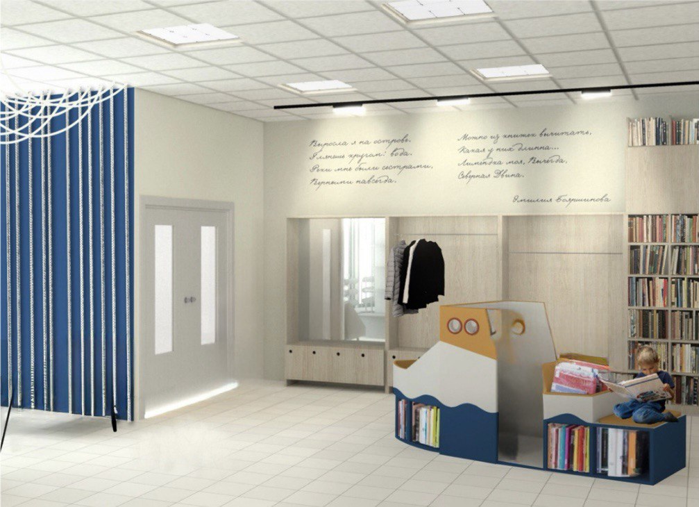 Каждая функциональная зона в библиотеке будет носить образные названия, тоже связанные с основной тематикой. При входе посетители библиотеки будут попадать на «Причал», для юных читателей будет создан «Остров Детства», в «Кают-компании» будут встречаться участники кружков и клубов и т. д. А на «Острове памяти» появится музей имени Э. И. Бояршиновой. Строки из ее стихотворения, вдохновившие сотрудников библиотеки на создание такой дизайн-концепции, будут написаны на стене: